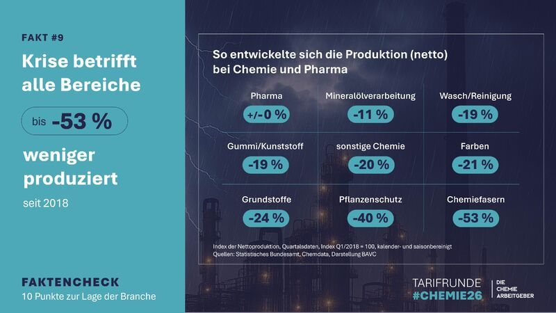 Die Hauptursachen sind klar: hohe Energie- und Rohstoffkosten, die den Standort belasten, und eine schwache industrielle Nachfrage, die sich durch nahezu alle Wertschöpfungsstufen zieht. Hinzu kommt die Belastung durch Bürokratie sowie hohe Arbeits- und Sozialkosten. In Summe haben weite Teile der Branche so ihre Wettbewerbsfähigkeit verloren. Deshalb braucht die Branche jetzt Entlastungen in allen Bereichen. Für die Tarifrunde #Chemie26 bedeutet das jetzt: Vernunft und Verlässlichkeit in Form einer tarifpolitischen Atempause.