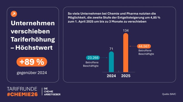 Industriegewerkschaft IGBCE und BAVC hatten im Tarifabschluss 2024 (#Chemie24) zwei Entgelterhöhungen vorgesehen: eine um 2 Prozent ab 1. September 2024 und eine um 4,85 Prozent ab 1. April 2025.